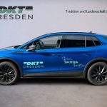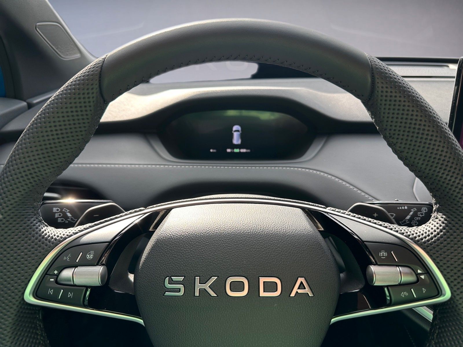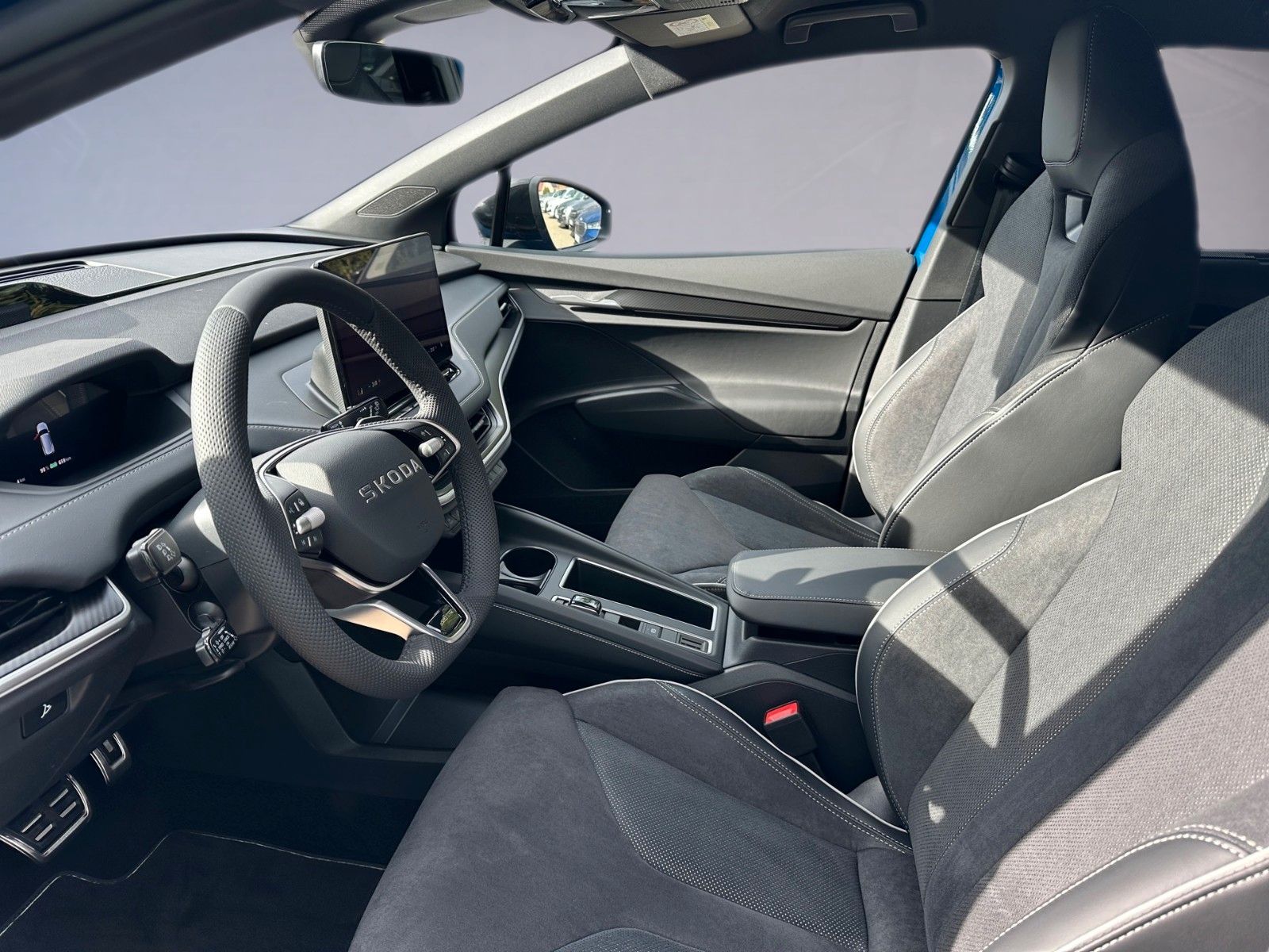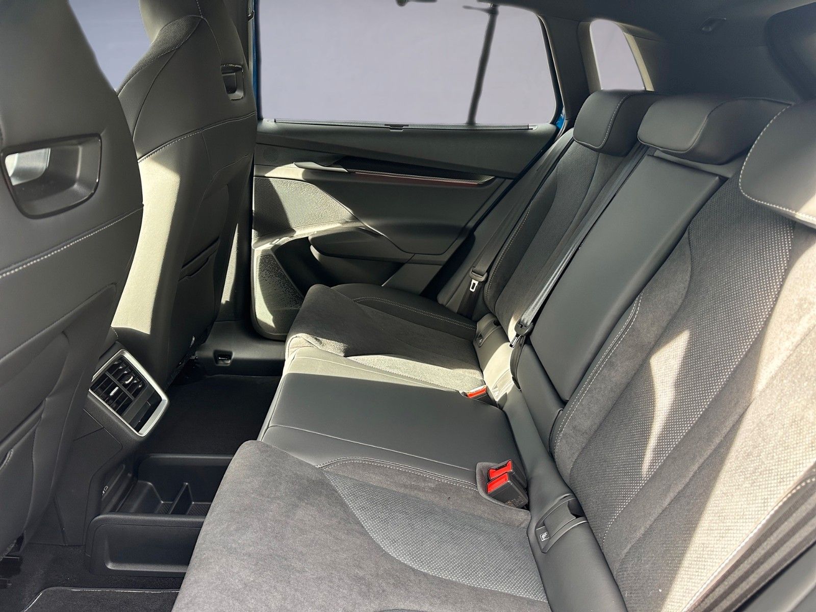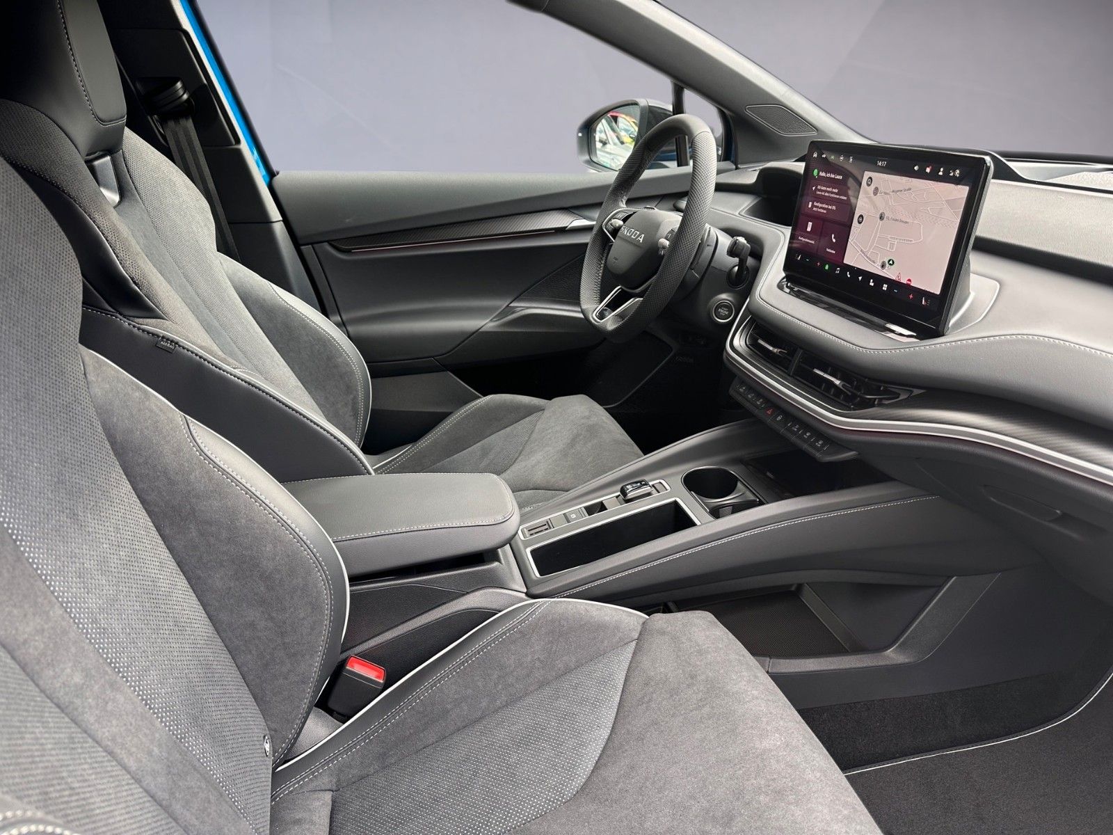 8 Lautsprecher, Ablagefach für Regenschirm, Ablagefach Türverkleidung hinten, Ablagefächer (Gepäck-/Laderaum), Airbag Beifahrerseite abschaltbar, Airbag Fahrer-/Beifahrerseite, Akustischer Fußgängerschutz, Außensound (e-sound), Ambiente-Beleuchtung LED, Antriebsart: Heckantrieb, Ausstattungs-Paket: Clever, Ausstattungs-Paket: Plus, Außenspiegel elektr. verstell-, heiz- und anklappbar, mit Abblendautomatik, Außenspiegel Wagenfarbe, Dachhimmel grau, Dachreling eloxiert, Design Selection Sportline, Easy Start (Keyless Easy Entry), Edelstahlpedale Sportdesign, Elektromotor 210 kW (cont. 89 kW), Fahrassistenz-System: Abbiegebremsfunktion und Ausweichunterstützung, Fahrassistenz-System: Auffahrwarnsystem mit City-Notbremsfunktion (Frontradar-Assistent), Fahrassistenz-System: Autom. Distanzregelung (ACC) mit Frontradar-Assistent (bis 210 km/h), Fahrassistenz-System: Intelligente Geschwindigkeitsanpassung (ISA) inkl. Speed-Limiter, Fahrassistenz-System: Multikollisionsbremse (Multi Collision Brake), Fahrassistenz-System: Müdigkeitserkennung, Fahrassistenz-System: Spurwechselassistent inkl. Auspark-Assistent und Ausstiegswarnung, Fahrassistenz-System: Verkehrszeichenerkennung, Fensterheber elektrisch vorn + hinten, Fensterzierleisten Unique Silver Chrome, Fußraumbeleuchtung vorn und hinten LED, Gepäck-/Laderaumabdeckung, Geschwindigkeits-Begrenzeranlage, Getriebe für Elektrofahrzeug, Heckscheibenwischer, HV-Batterie 82 kWh brutto / 77 kWh netto, Infotainment-System mit 13" Display, Innenausstattung: Dekoreinlagen Dark Carbon, Innenspiegel mit Abblendautomatik, Insassen-Schutzsystem proaktiv, Isofix-Aufnahmen für Kindersitz an Beifahrersitz und Rücksitze außen (inkl. Top Tether), Karosserie: 5-türig, Kindersicherung, manuell, Klimaanlage Climatronic 2-Zonen, Kofferraumbeleuchtung, Kombiinstrument digital (virtual cockpit), Komfort-Freisprecheinrichtung Bluetooth, mit Sprachsteuerung, Komfortsitze vorn, Kopf-Airbag-System, Kopfstützen vorn und hinten verstellbar, Ladekabel mit Typ 2-Stecker (Mode 3), Lenkrad heizbar (Sport/Leder) mit Multifunktion und Schaltfunktion, Lenksäule (Lenkrad) verstellbar (vertikal / axial), Leuchtweitenregelung, Licht- und Regensensor, Lichtassistent (Coming Home, Leaving Home), LM-Felgen, Parkbremse elektronisch, Radioempfang digital (DAB+), Radstand Standard, Reifen-Reparaturkit, Reifendruck-Kontrollsystem, Rückfahrkamera, Rücksitz geteilt / klappbar (60:40) Mittelarmlehne und Durchladefunktion, Scheinwerfer LED, Schnellladevorrichtung (CCS-Ladedose), Seitenairbag vorn, Seitenairbag vorn mitte (Center-Airbag), Servolenkung elektronisch (Servotronic), Sicherheitsgurte Orange, Sitzbezug / Polsterung: Stoff/Kunstleder Sportline schwarz, Sitze vorn höhenverstellbar inkl. Lendenwirbelstütze verstellbar, Sitzheizung vorn, Smart-Paket, Sonderlackierung Energy-Blau, Sonnenblenden mit Spiegel (LED-Beleuchtung), Sport-Fahrwerk, Steckdose (12V-Anschluß) im Koffer-/Laderaum, Stoßfänger Sport-Design, Textilfussmatten, Türgriffe außen Wagenfarbe, USB-Schnittstelle vorn (2-fach, Typ C), Vorbereitung für Alkohol-Wegfahrsperre (Alcolock), Warnanlage für Sicherheitsgurte hinten, Warnanlage für Sicherheitsgurte, Fahrer-/Beifahrerseite, Wireless SmartLink